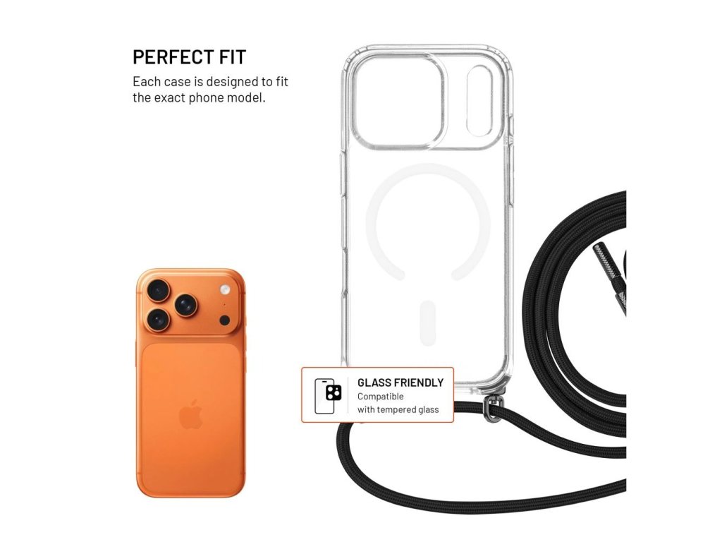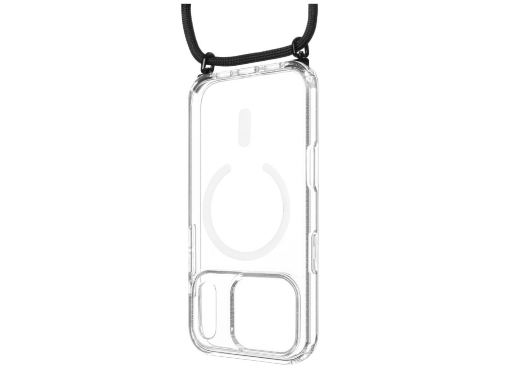 Délku šňůrky si snadno přizpůsobíte díky kvalitním kovovým komponentům. Pouzdro je vyrobeno z odolného polykarbonátu v kombinaci s měkkými TPU boky, které tlumí pády a nárazy. Čirý materiál zároveň přirozeně odolává žloutnutí a lehce zvýšené hrany v oblasti fotoaparátu a displeje je chrání před kontaktem s povrchem a případným poškrábáním. Díky integrovaným MagSafe magnetům drží bezpečně přichycený k nabíječkám, držákům a dalšímu magnetickému příslušenství. Ať už vyrážíte do města nebo na výlet, je pouzdro stylovým a praktickým řešením pro nošení vašeho telefonu.